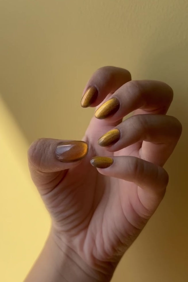光や角度によってオレンジっぽくもブラウンっぽくもグリーン?グレー?っぽくも見えて、すごく好みの色味です!かわいくてずっと指先を見てしまいます♡