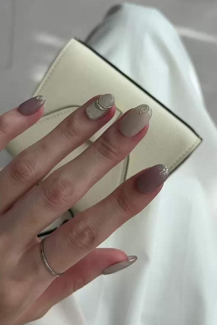 グレーとベージュ、グリーン味もある色味が融合して、市販のネイルには無い色味です。ブルベさんにお勧めの色です。