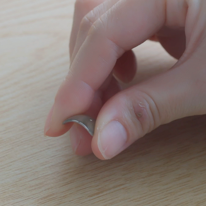 チップを温めて、じんわり曲げる。自爪のカーブに合わせます。
