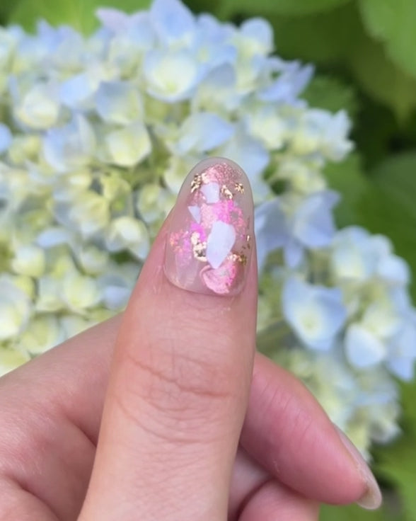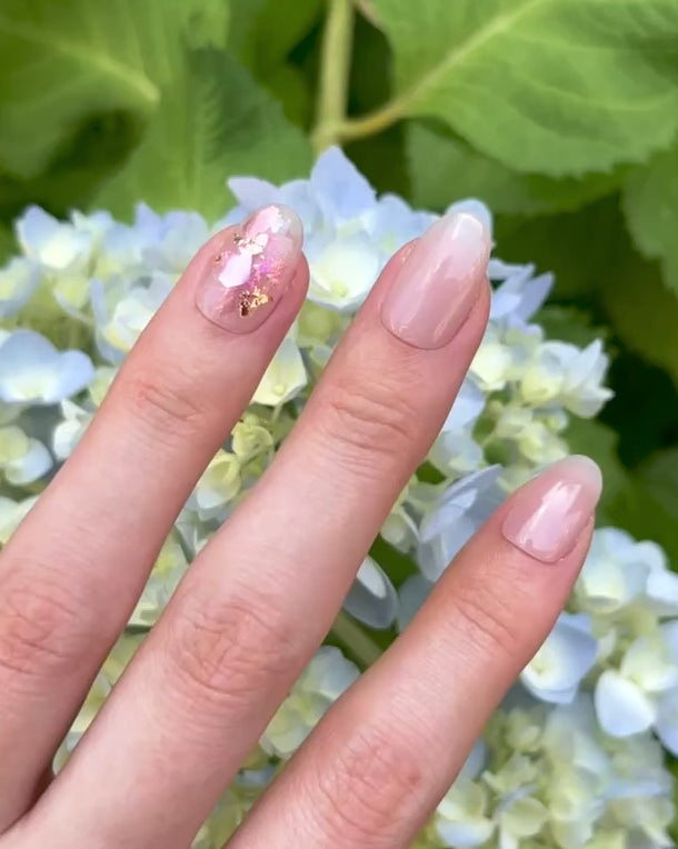 友人からはネイルチップには見えないと言われました!好評です。色味は落ち着いているピンクでありつつも金箔がアクセントになっていて手元が映えるデザインです。