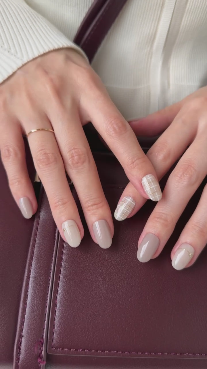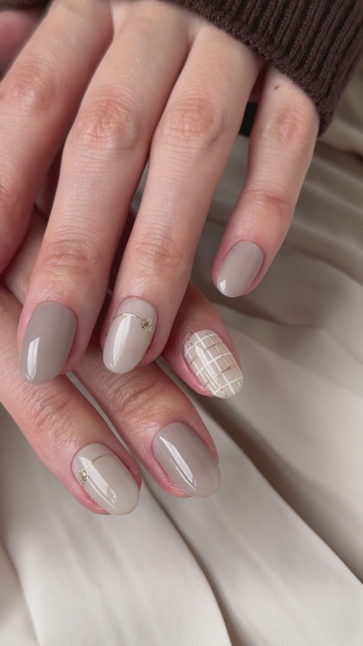 落ち着いた色味で派手ではありませんが、ゴールドのラインがキレイで、場所を選ばず使えるネイルです。